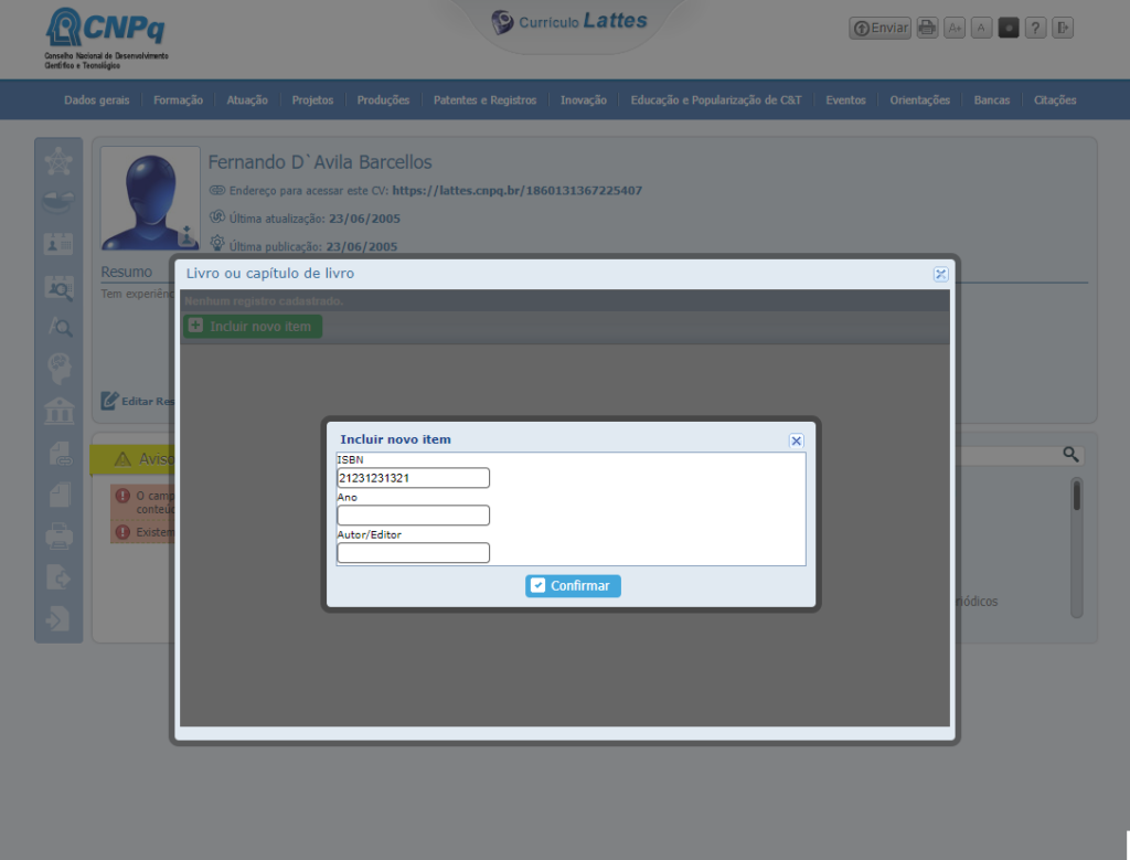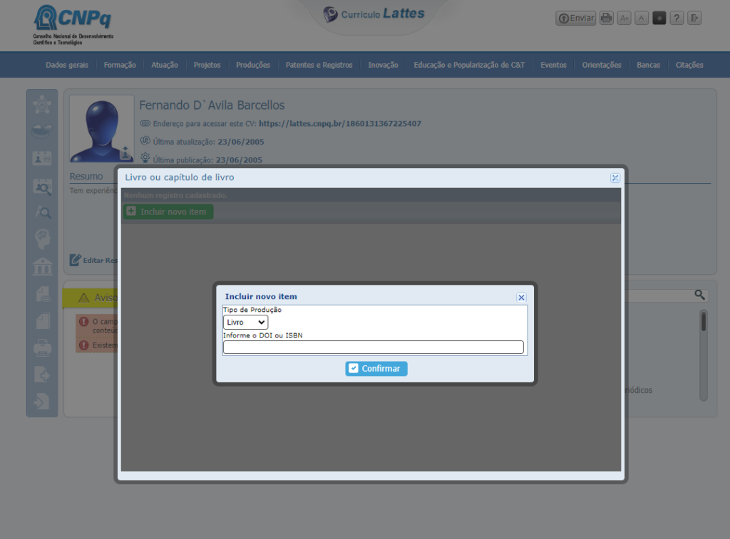 Na coluna de “Produção Bibliográfica”, clique na opção “Livros e Capítulos”. Em seguida, clique em “Incluir novo item”, selecione “Livro” ou “Capítulo” e depois preencha o “DOI” ou “ISSN”.